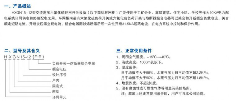 HXGN15-12系列環(huán)網(wǎng)柜適用于城市電網(wǎng)改選和建設(shè)需要的新一代高壓電器產(chǎn)品。內(nèi)部元件均選用國內(nèi)目前先進(jìn)產(chǎn)品。該產(chǎn)品經(jīng)形式試驗(yàn)和長期的運(yùn)行考核,并有滿足二次要求的可靠防誤操作措施。防護(hù)等級達(dá)到IP2X,且具有體積小,重量輕、操作簡單、操作環(huán)網(wǎng)柜適應(yīng)于廠礦、住宅小區(qū)、高層建筑、學(xué)校、公園等場所的三相額定電壓10kV、額定頻率50Hz的配電系統(tǒng),作為接受和分配電能之用。可用于環(huán)網(wǎng)供電和終端供電,也可裝在箱式變電站中。